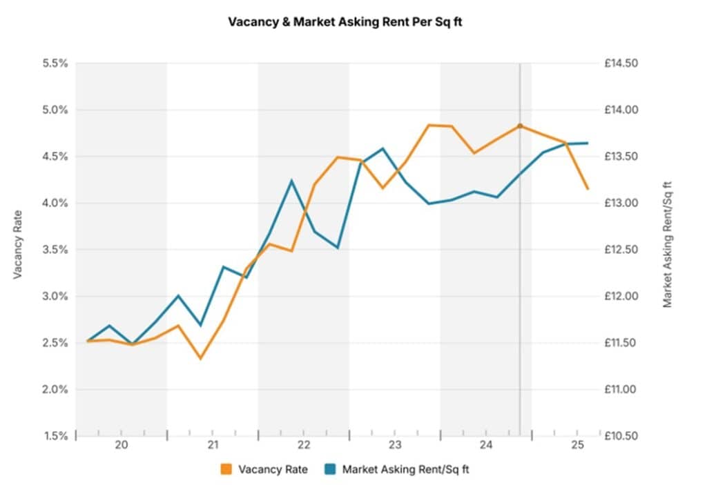 Nationally office vacancy rates across the UK continued to climb last year, this being amid a fifth straight year of negative net absorption, meaning more space was vacated than occupied.