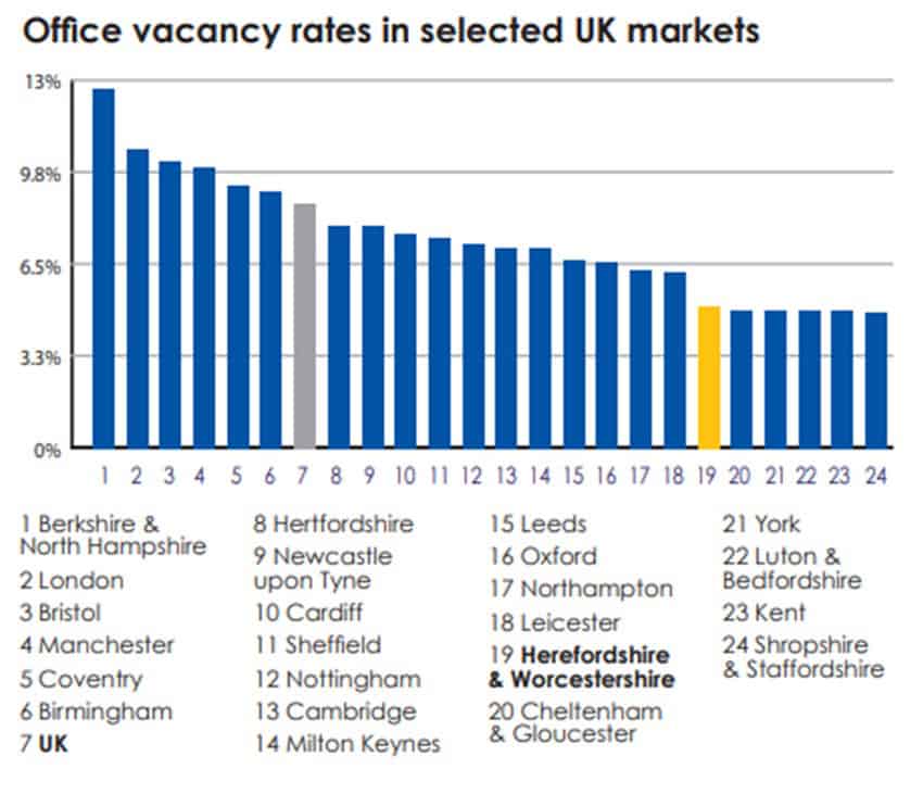 However, the office sector is polarised, with prime modern space being favoured over older stock, with net absorption in the best quality buildings remaining positive and all the demand losses occurring in buildings rated four stars or below. Across the UK, and here in Worcestershire, firms are seeking top quality space to attract and retain staff, welcome clients, and to meet growing environmental commitments.