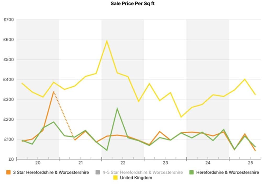 The chart above shows how the regional market of Herefordshire & Worcestershire is well below the national average when looking at sales rates per sq ft. This again is reflective of the quality of the stock and the lack of returns offered by the lettings market. Whilst we may never compete with the major city office markets in terms of the quality of space, what would be encouraging to see is a gradual increase in sales rates, thus encouraging investment into the area and improving our office space offering to businesses currently in the region and those looking to relocate here.