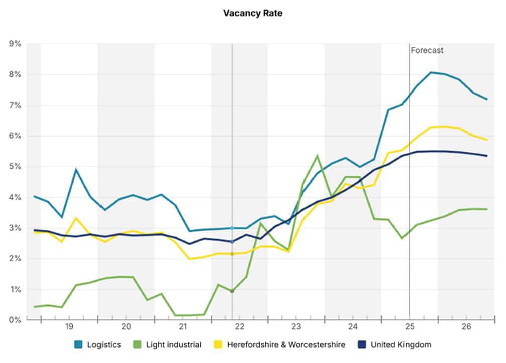 Industrial market conditions in Worcestershire have softened in recent quarters. Vacancies have risen, albeit from a low base, as demand has cooled and supply has increased. Some occupiers remain cautious amid economic uncertainty and inflationary pressures, though we are seeing an uptick in enquiry levels, something that certainly started in Q1/Q2 2025, perhaps slowed over the summer months but is very much being felt this last month and into the autumn.